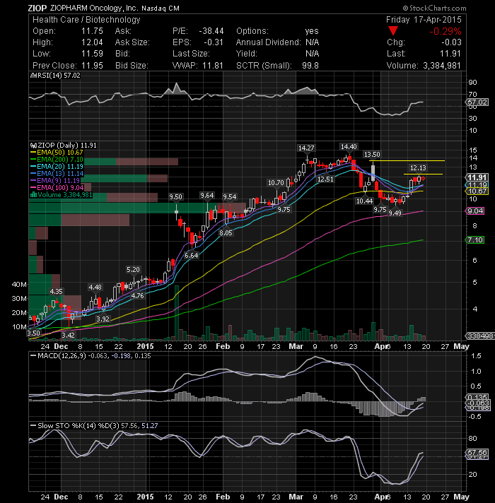On the daily technical chart above, the share price of ZIOPHARM Oncology Inc.(NASDAQ:ZIOP) has been trading sideways for the past couple of weeks after correcting from its all-time high of 14.40, which could be interpreted as a bull flag pullback. If price can get back over 12.13 then the bull case will win and we should look for a move to resistance at 14.