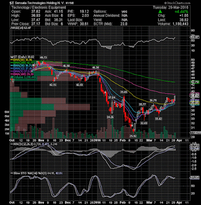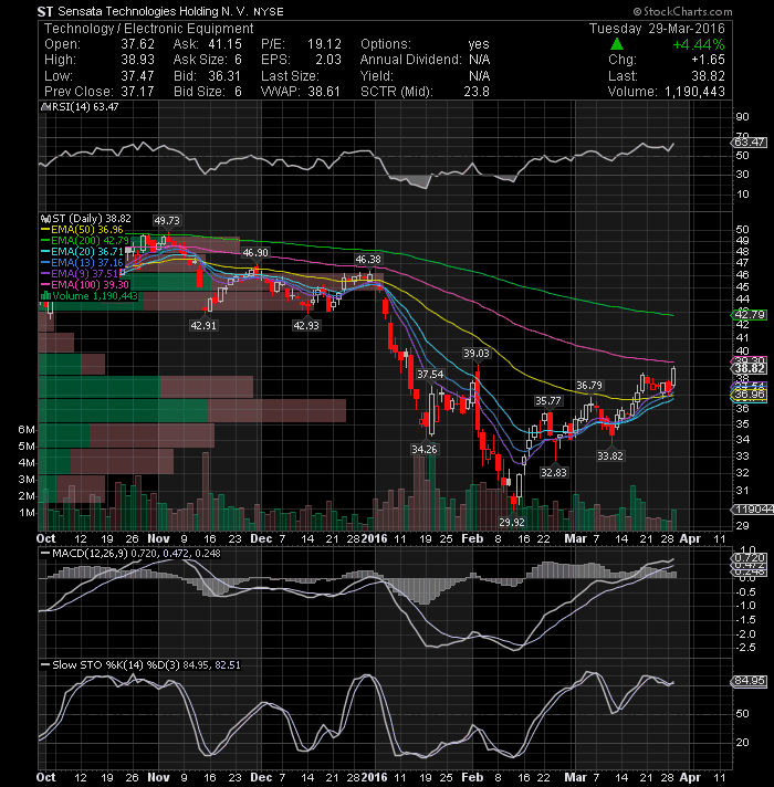 Sensata Technologies Holding N.V. (NYSE:ST) broke out of a flag formation on higher volume today. This will lead to a price target of 39.75-40.20. Key indicators on daily charts suggest continuation of positive bias and the stock price is likely to show further up side.