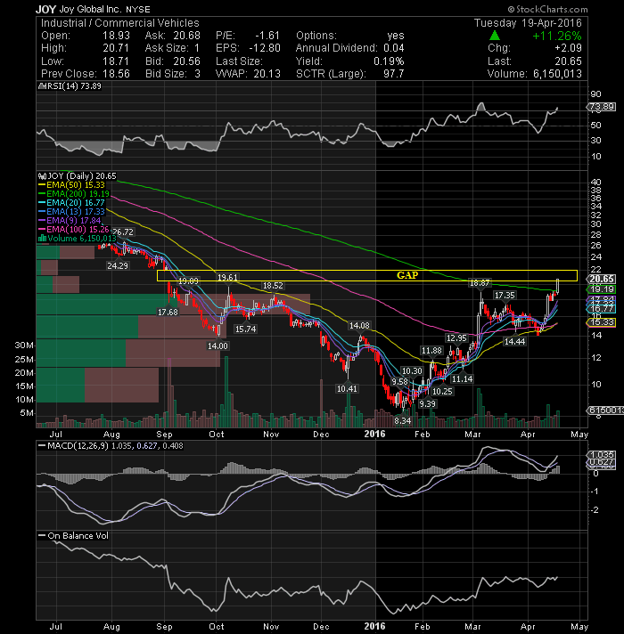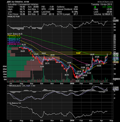 Shares of Joy Global Inc. (NYSE:JOY) gained more than 11 percent, closing near its highs of the day on strong volume. The stock broke through resistance and out of a small flag formation. Next resistance is now seen at $22 (closing gap).