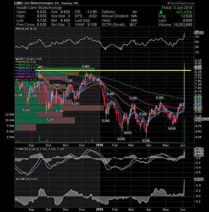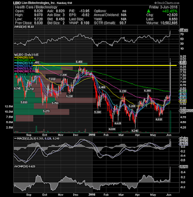 Shares of Lion Biotechnologies Inc (NASDAQ:LBIO) soared 43.45% or 28 cents to $8.65 per share on heavy trading volume Friday after announcing a new CEO and raising about $100M in a private offering. It broke out of a major resistance area around 8.40's and it will be very bullish if it can continue to rally next week. Friday's high is immediate resistance on the upside for another fast short squeeze.