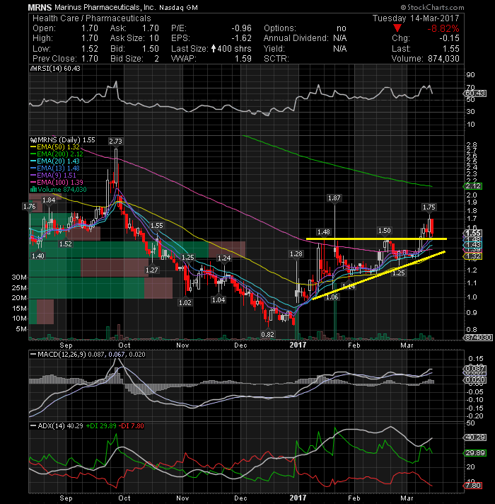 Marinus Pharmaceuticals Inc (NASDAQ:MRNS) pulled back on low volume into a strong support area after such a nice run on Monday. The bias remains to the upside.