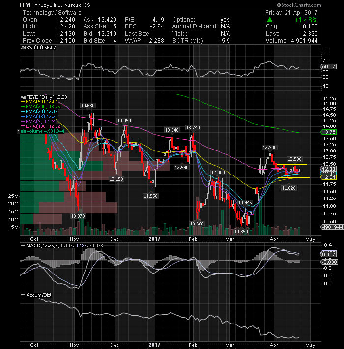 FireEye Inc (NASDAQ:FEYE) watch for a potential breakout of resistance and successful re-test to confirm further bullish view. If breakout occurs the next target level is in 13 area.