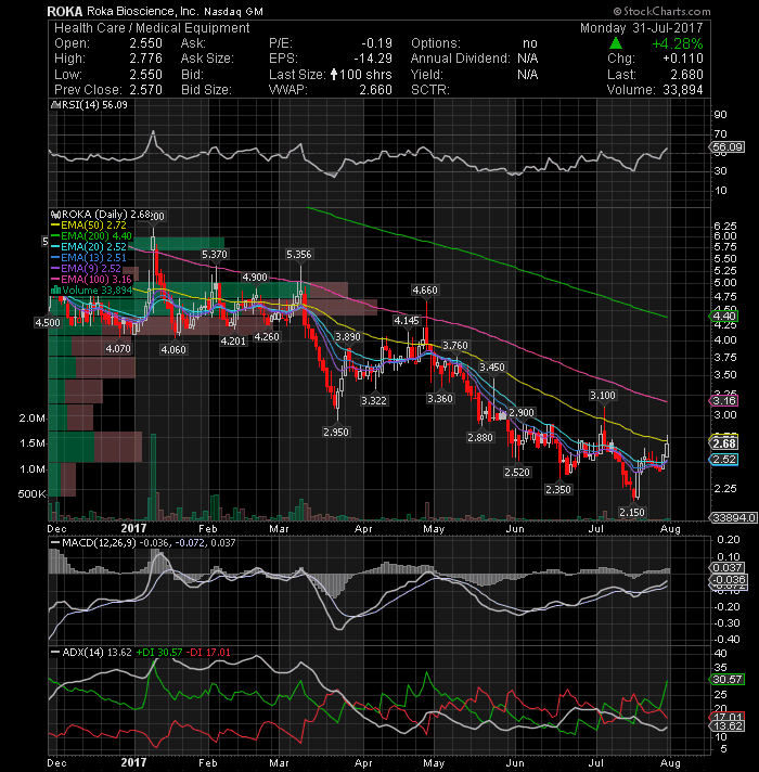 Roka Bioscience Inc (NASDAQ:ROKA) Setting up a possible resistance breakout trade. Go long on the break of Monday’s high at 2.77. Indicators are turning up. Love the price action on this.