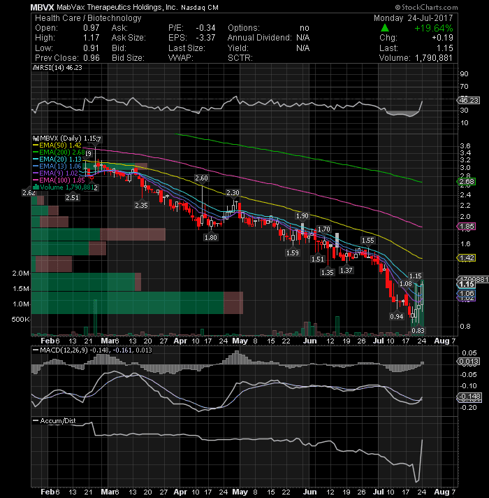 MabVax Therapeutics Holdings, Inc. (NASDAQ:MBVX) key resistance has been broken. The price can move up to 1.30-1.35 in the short-term. Now that the stock is above the 1.08 resistance area more buyers should be coming. Keep the stock on your radar.