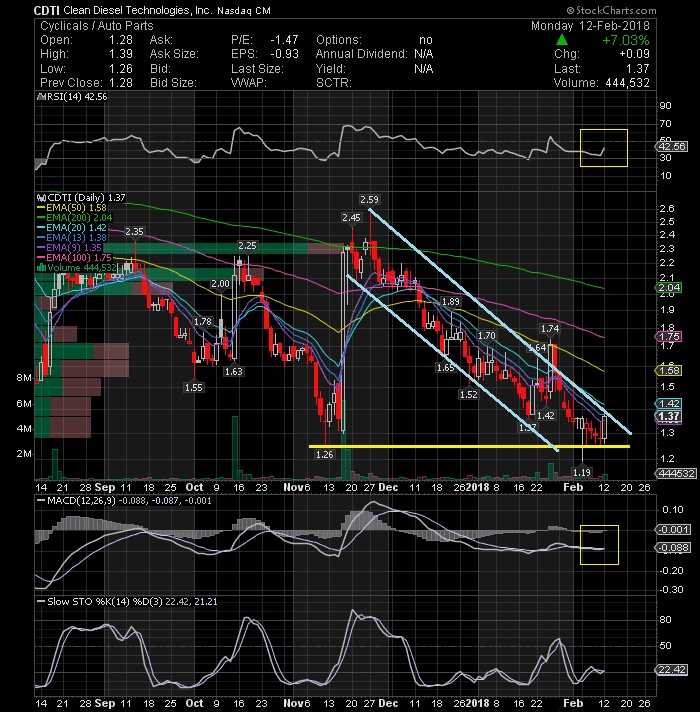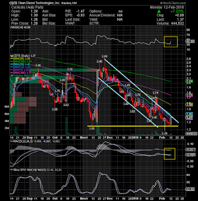 Rexahn Pharmaceuticals, Inc. (NYSEAMERICAN:RNN) was over $2.65 last month and closed yesterday at $1.74. We could see a sharp rally next week out of these oversold conditions. There is also a potential triplle bottom formation on daily with some positive divergences and a breakout of $1.80 is likely to confirm it. With the 200-day exponential moving average at $2.33, there is a lot of room for this rebound to go. Stop 1.67