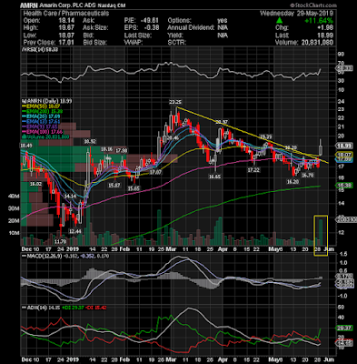 Amarin Corporation plc (NASDAQ: AMRN) Closed yesterday above the downtrend line and looks like it will continue to run up. Buyable on pullbacks to pivot.