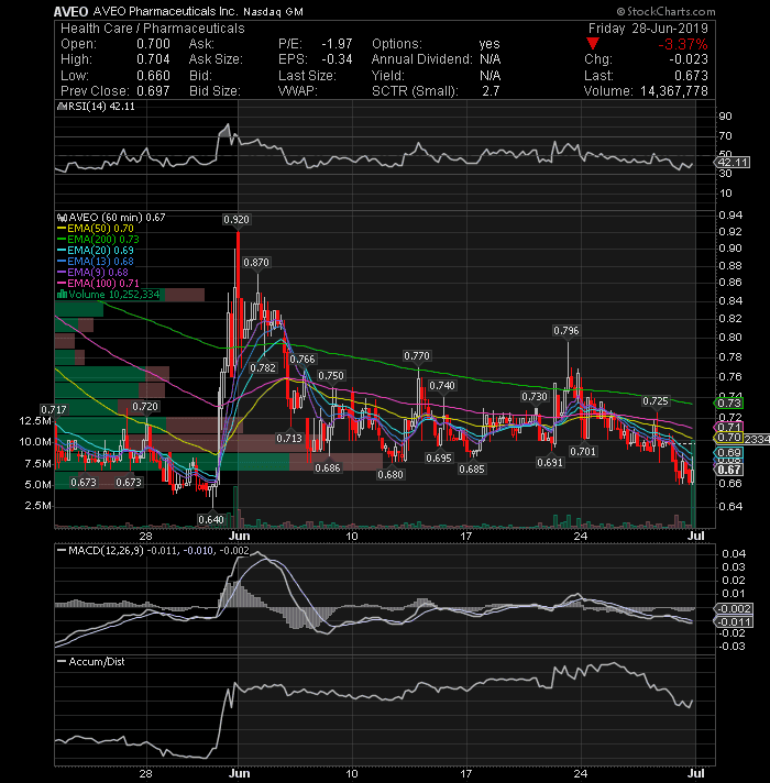 AVEO Pharmaceuticals, Inc. (NASDAQ: AVEO) has had a rough time over the past sessions, but somebody bought a lot of shares on Friday before the close of the day. A breakout over 70c next week with strong volume would send this flying. I went long last week, I see $1 move coming.