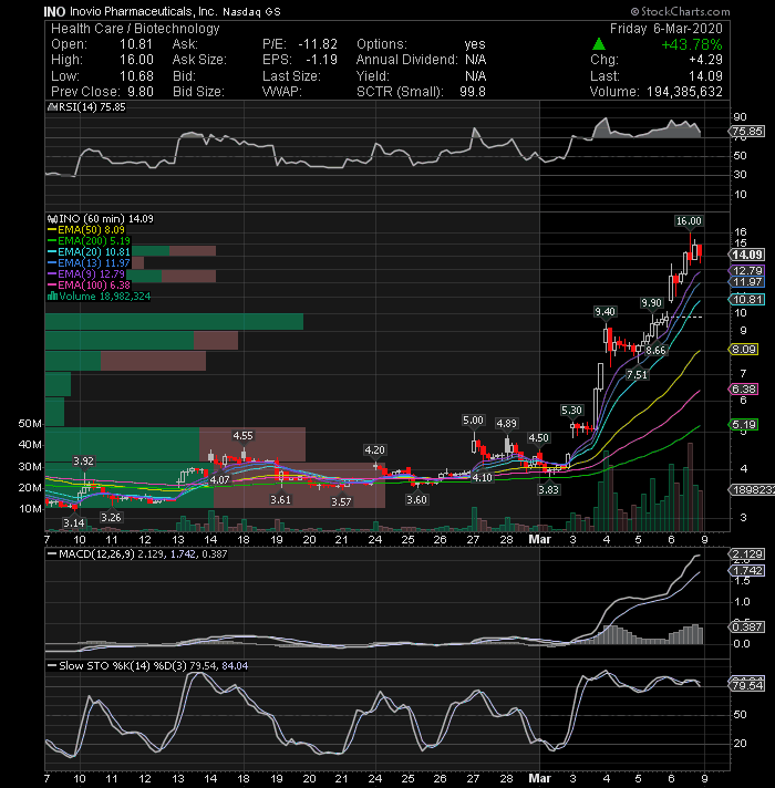 Inovio Pharmaceuticals Inc (NASDAQ:INO) stock is up almost 230% from late February. As I always say, follow the money and the money looks to be flowing into this one. I signaled a buy alert on the breakout. INO’s move has been parabolic and is currently very overbought in all time-frames. A healthy correction or sideways consolidation may be coming to provide an opportunity to work off this strong rise and pullback to immediate support 12.79 EMA9 on hourly chart. As long as the stock stays above the $10 mark on a close basis, the intermediate uptrend by the stock is likely to remain intact.