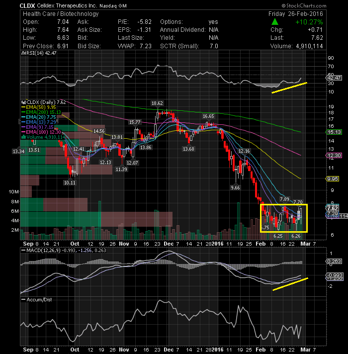 Celldex Therapeutics, Inc. (NASDAQ:CLDX) For the past few weeks, the stock price has been consolidating within a rectangular band between 6.25 and 7.89. There is a good possibility of the stock price trying to form a bottom here. With the daily momentum indicators on the above chart showing positive divergences I think a push to $9.60 or better could be in the making. Friday's high volume could be a signal for trend change and the beginning of a potential major move higher.