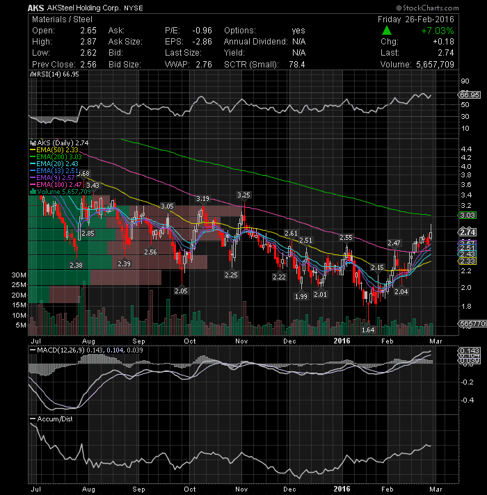 AK Steel Holding Corporation (NYSE: AKS) again closed above its 20-day EMA. This stock ,in my view, looks to be in the early stages of another rally that will bring the stock to over $3 a share.