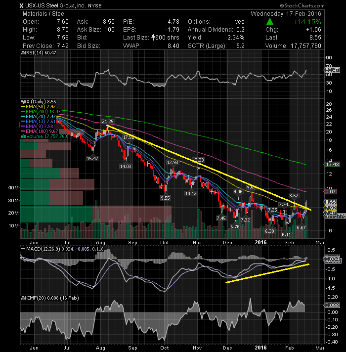 United States Steel Corporation (NYSE:X) is finally stepping up after weeks of frustration. The stock price is building momentum and broke today the downtrend line that it established since August 2015 on high volumes with 9.52 as the first upside objective. Long setup.