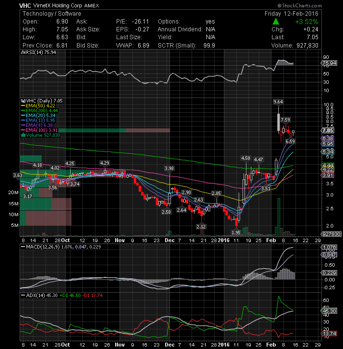 VirnetX Holding Corporation (NYSEMKT:VHC) rose 3.52%to $7.05 on Friday, closing at its session highs after spiking in the last hour. VHC is starting to gain interest again and could see a rapid ascent as the accumulation chart shows a trend reversal to the upside. Momentum indicators remain in overbought territory but are not yet giving any selling signals. Only a break above the 7.60 resistance area could take the price higher and negate the short-term bearish view. I will watch the stock closely on Tuesday.