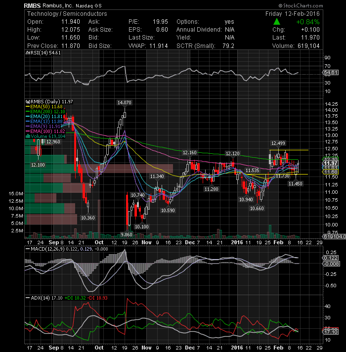 Rambus Inc. (NASDAQ:RMBS) As long as the stock holds above the $11.53 support level on a close basis, the intermediate-term picture should remain positive. Looking at the technical daily chart above, although the moving average still shows weakness as 50-day EMA is below 200-day EMA, positive momentum seems to be back as the stock is back above its major short-term EMAs. My bias remains neutral to bullish over the short to intermediate term.
