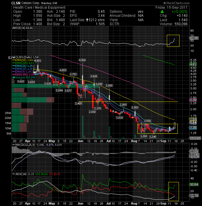 Celsion Corporation (NASDAQ:CLSN) The price action is creating a potential/temporary bottom. A rise above the $1.92 level tomorrow should confirm the reversal.