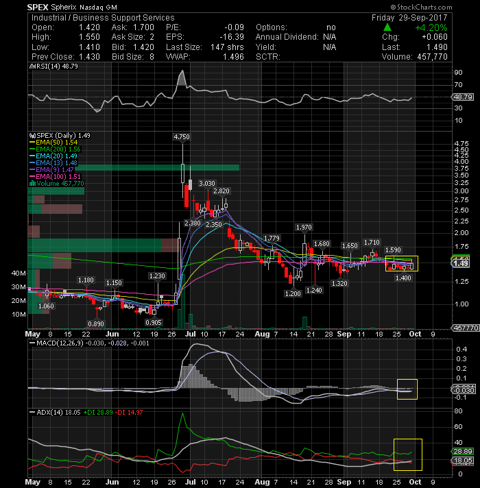 Spherix Inc (NASDAQ:SPEX) Still on my top long list (small caps). Could move toward $2 area if it breaks and closes above the 1.68 level. Technicals look Bullish to me. Momentum picking up with MACD climbing and RSI rising. Watch for continuation.