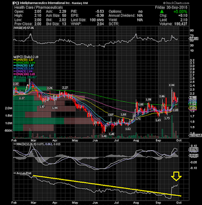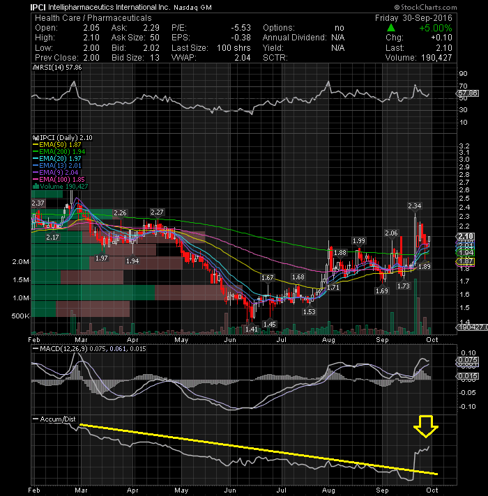 IntelliPharmaCeutics Intl Inc (NASDAQ:IPCI) Low volume pullback. Moving up after testing the rising 20-day EMA. Looking good technically right here. The Accumulation/Distribution line clearly shows lots of accumulation recording a five month high. The stock may attempt to go higher from here. If the near-by support at $2.01 (13EMA) holds up next week, a rally up to the $2.34 level is probable or even possible. Only a close below the $2 price level would negate the positive outlook. From a technical standpoint, IPCI is my momentum alert with huge Potential.