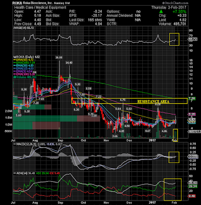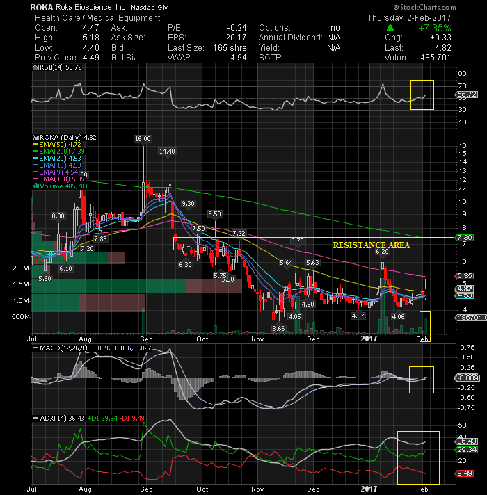 Roka Bioscience Inc (NASDAQ:ROKA) has become increasingly bullish and today the stock closed back above its EMA50 on solid volume. We have all seen how quickly ROKA can head higher, when the buyers come. I believe it is ready to post a nice bounce and I do not see any real resistance on the technical chart until $7. This is a low float stock that can run fast on any volume.