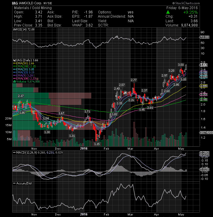 IAMGOLD Corp (NYSE:IAG) continued its bullish fervour last week making another new high of 3.71 on Friday. Daily technical indicators are Bullish with the RSI and MACD rising. With the spike in volume and momentum surging in Friday's trading sesison, there is a high possibility that the stock price can appreciate even more in value during the coming sessions. Next resistance is now seen at 4.10. Keep it on your watch list going forward.