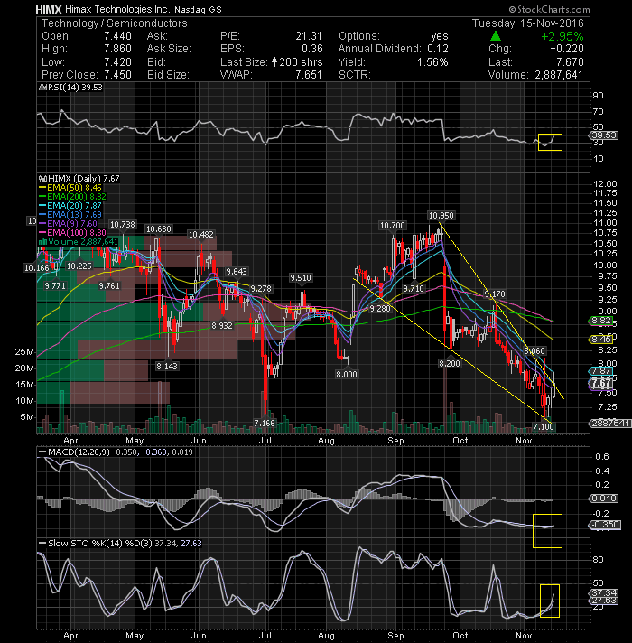 Himax Technologies, Inc. (NASDAQ: HIMX) had a nice breakout with a pop of 57c to 8.02 or 7.65% on 5.6 million shares. Technical daily chart shows a bullish sign as the stock is back on top of 100-day EMA with MACD rising and in positive territory. We should be able to see some decent upside movement for the bulls here.