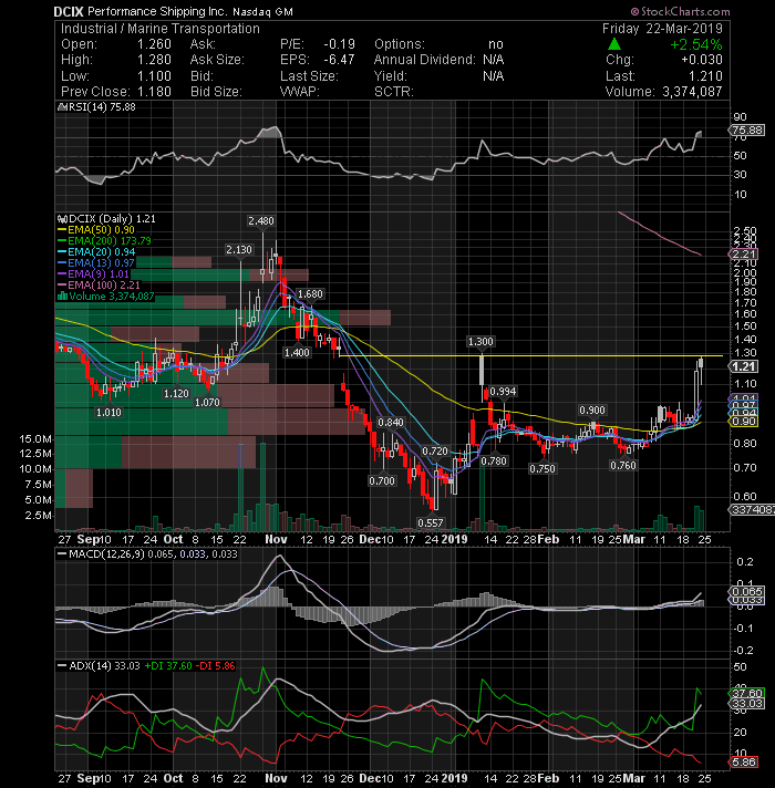 Performance Shipping Inc (NASDAQ: DCIX) has had a hard time with resistance here but may be ready to move higher. The level which the stock may have trouble moving above is currently at $1.30 It would need to break above that level to run to $2. Watch the stock closely next week.
