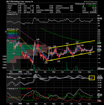 FORM Holdings Corp. (NASDAQ:FH) Daily technical chart is starting to heat up again, along with all the recent positive developments in their press releases. In addition, the bullish insiders (On Monday, Director Richard Abbe purchased 152,005 shares at $2.11) should indicate the stock is really worth buying. The stock is currently within a rising channel and this new wave could send the stock up into the 2.80 range. Daily MACD also flashed today a buy signal above zero. On watch.