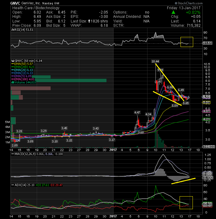 GenVec Inc (NASDAQ:GNVC) broke the falling wedge last week on the hourly chart and more bulls should join the party on a breakout above the immediate resistance line at 6.49. The short-term momentum indicators are starting to turn back higher.