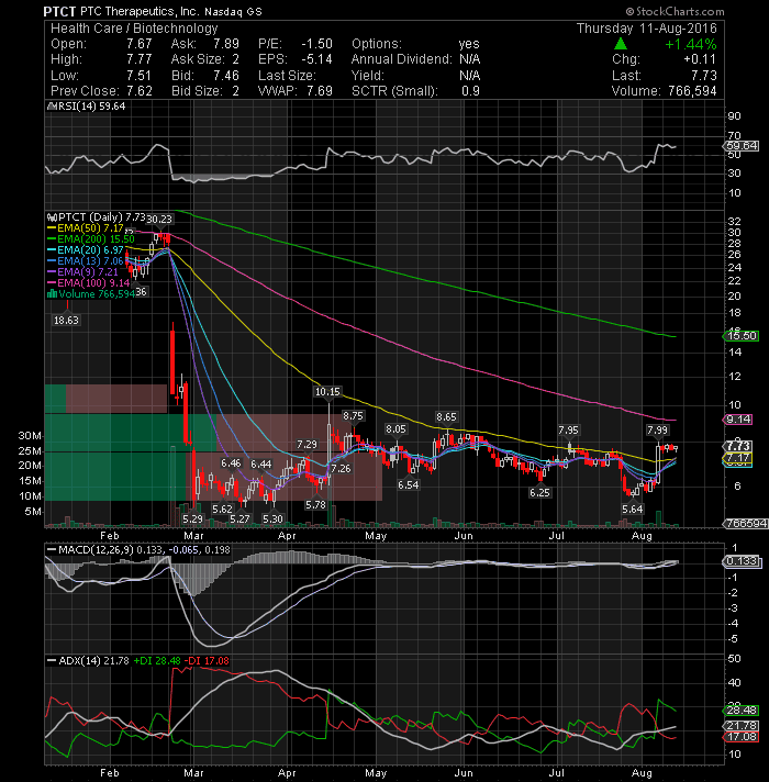 PTC Therapeutics, Inc. (NASDAQ:PTCT) Watch this bull flag formation. Good long setup, if it takes out the $8 level on volume.