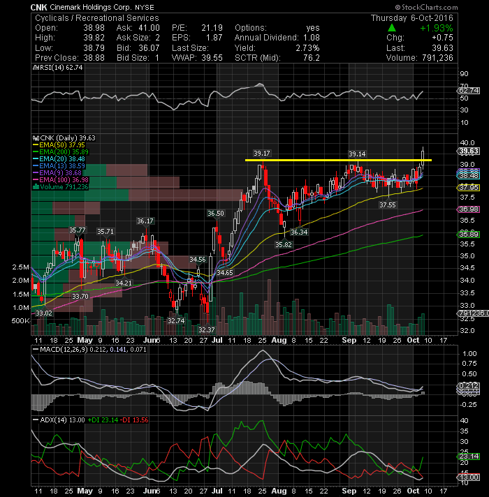 Cinemark Holdings, Inc. (NYSE:CNK) Good break higher Thursday, clearing the prior highs on high volume. There is a good chance it will continue to move up. Buyable on a pullback to the pivot.
