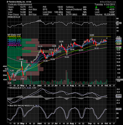 Pandora Media Inc (NYSE:P) tried to breakout above the $15 level today but quickly failed. Only a close above this level would suggest further upside.